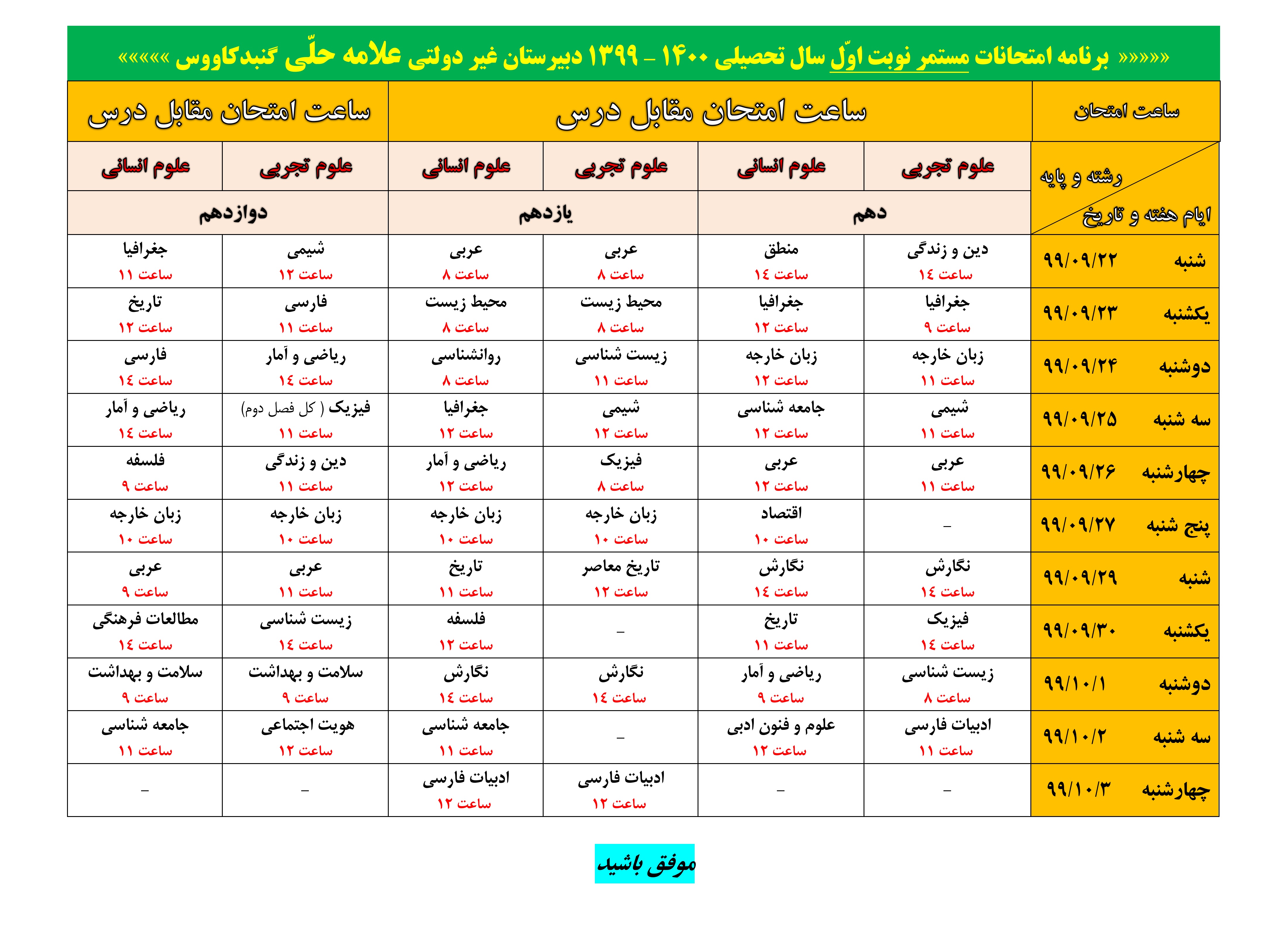 برنامه هفتگی بعد از امتحانات نوبت اول