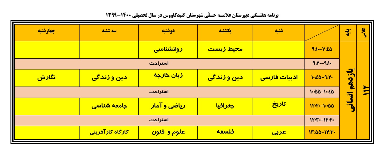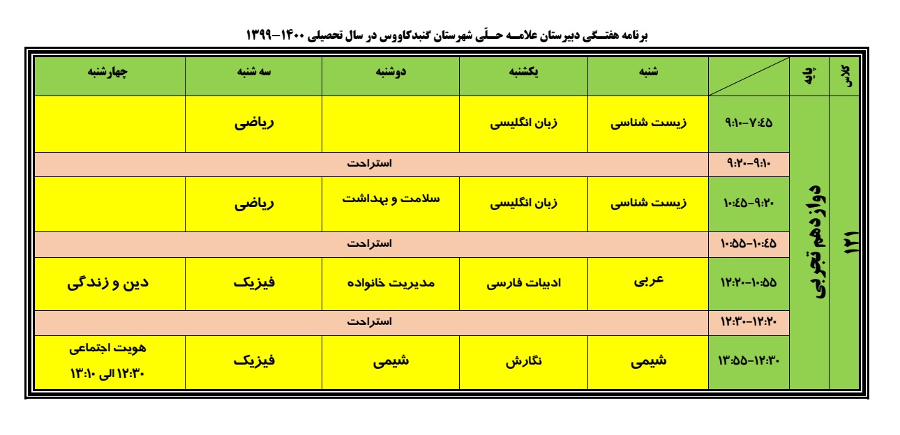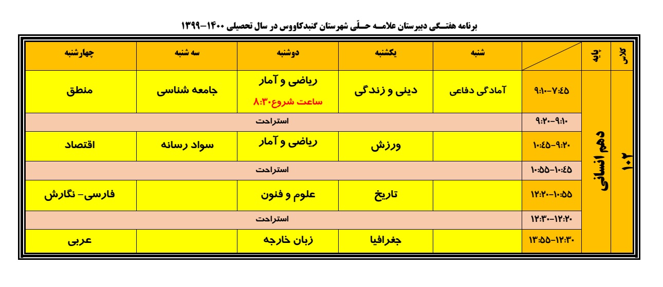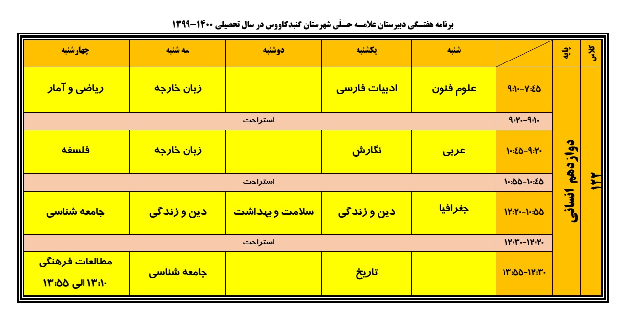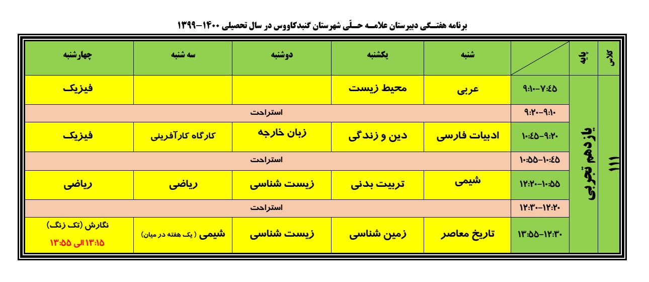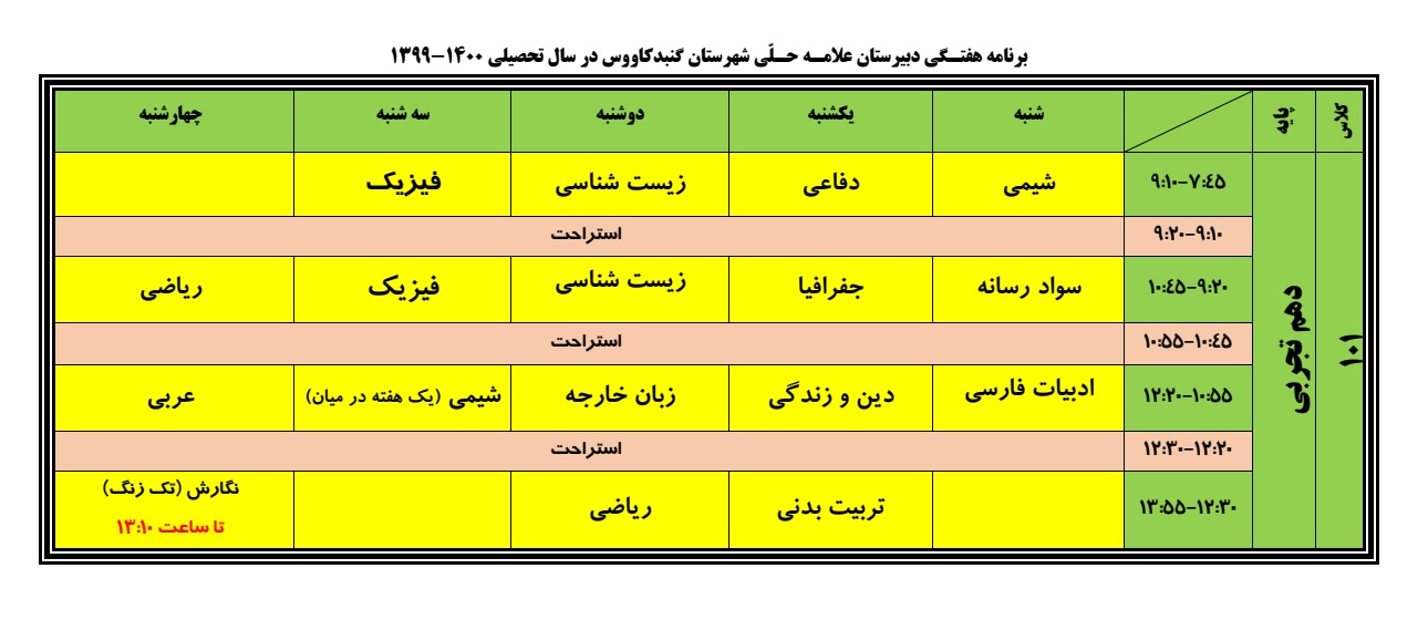 برنامه هفتگی بعد از امتحانات نوبت اول